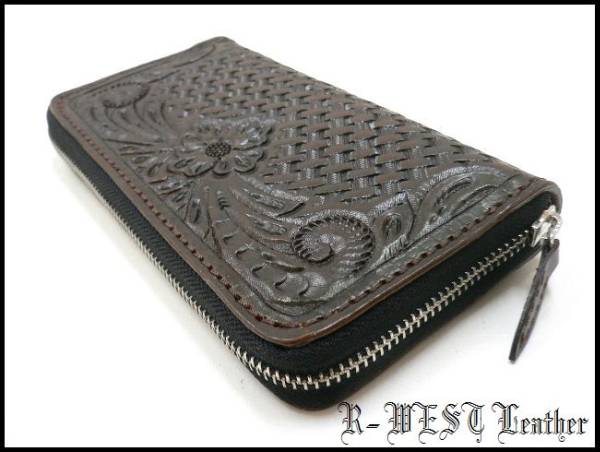 - 牛革カービング花柄バスケット レザーウォレット/こげ茶/ファスナータイプ