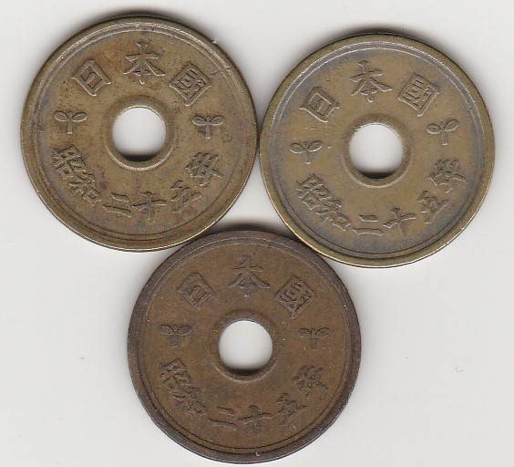 - ★★5円黄銅貨 昭和25年 3枚★