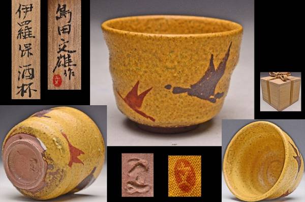 - 島田文雄 ★ 伊羅保ぐい呑 ★ 共箱共布 ★ 希少作品 ! ★ 鶴文 ★ 人間国宝 藤本能道 田村耕一に学ぶ