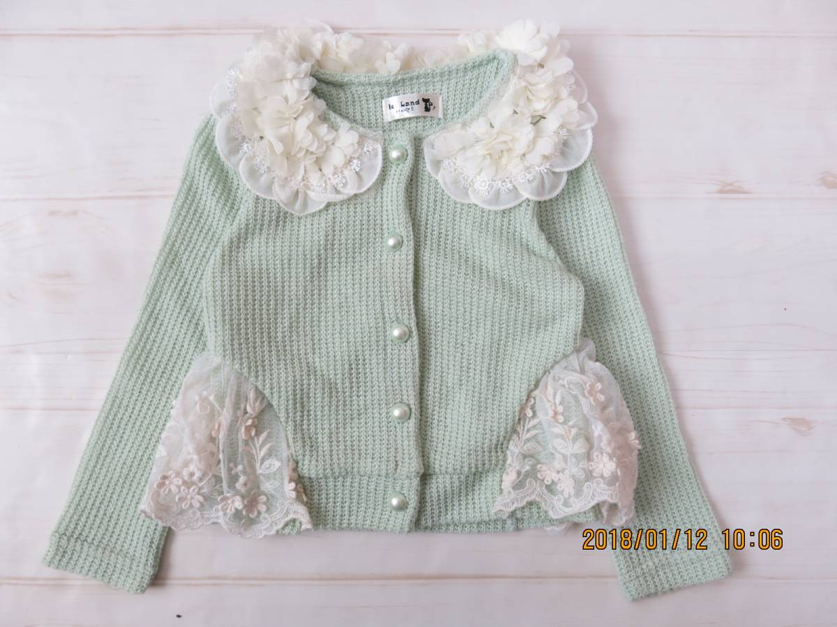 - ミントグリーンのニットカーディガン【80】レース女の子韓国ブランド