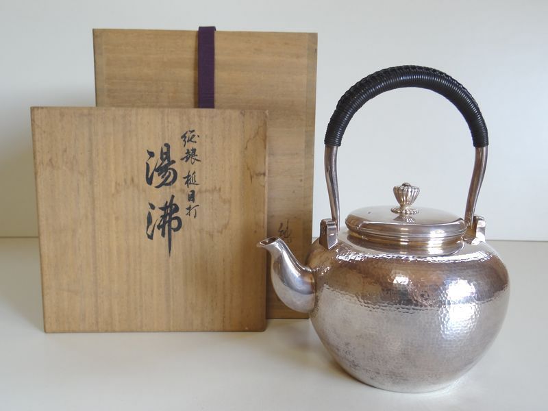 - 銀瓶 純銀 槌目打 湯沸 384g 共箱付 鉄瓶