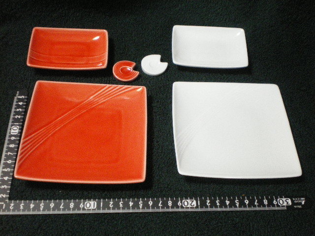 - 珍品フリマ] 陶器 深山 MIYAMA 新品同様 元桐箱 紅白2客ずつ 中型浅皿正方形13.4cm 小型浅皿長方形10cm ×7.1cm 箸置き3.2cm[送料無料]