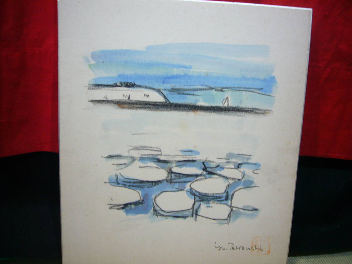 - 【ARS書店】『色紙』・☆☆《・網走港・流氷・》☆☆・【・作者:竹内豊・】1980年頃・ペンサイン落款・全道美術会員・独立美術会員・額付