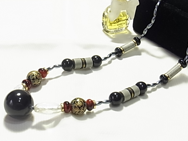 - 和モダンテイスト 大粒の黒のオニキス調のビーズストーンにガラス調ストーンなどが美しい シックな色味 ネックレス▼