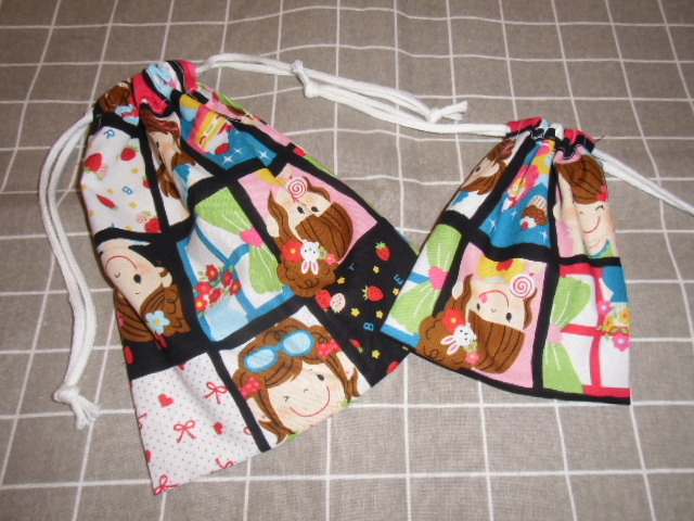 - 中小6 巾着袋 小物入れ 給食袋 ハンドメイド 2枚セット ガールズ柄 黒色
