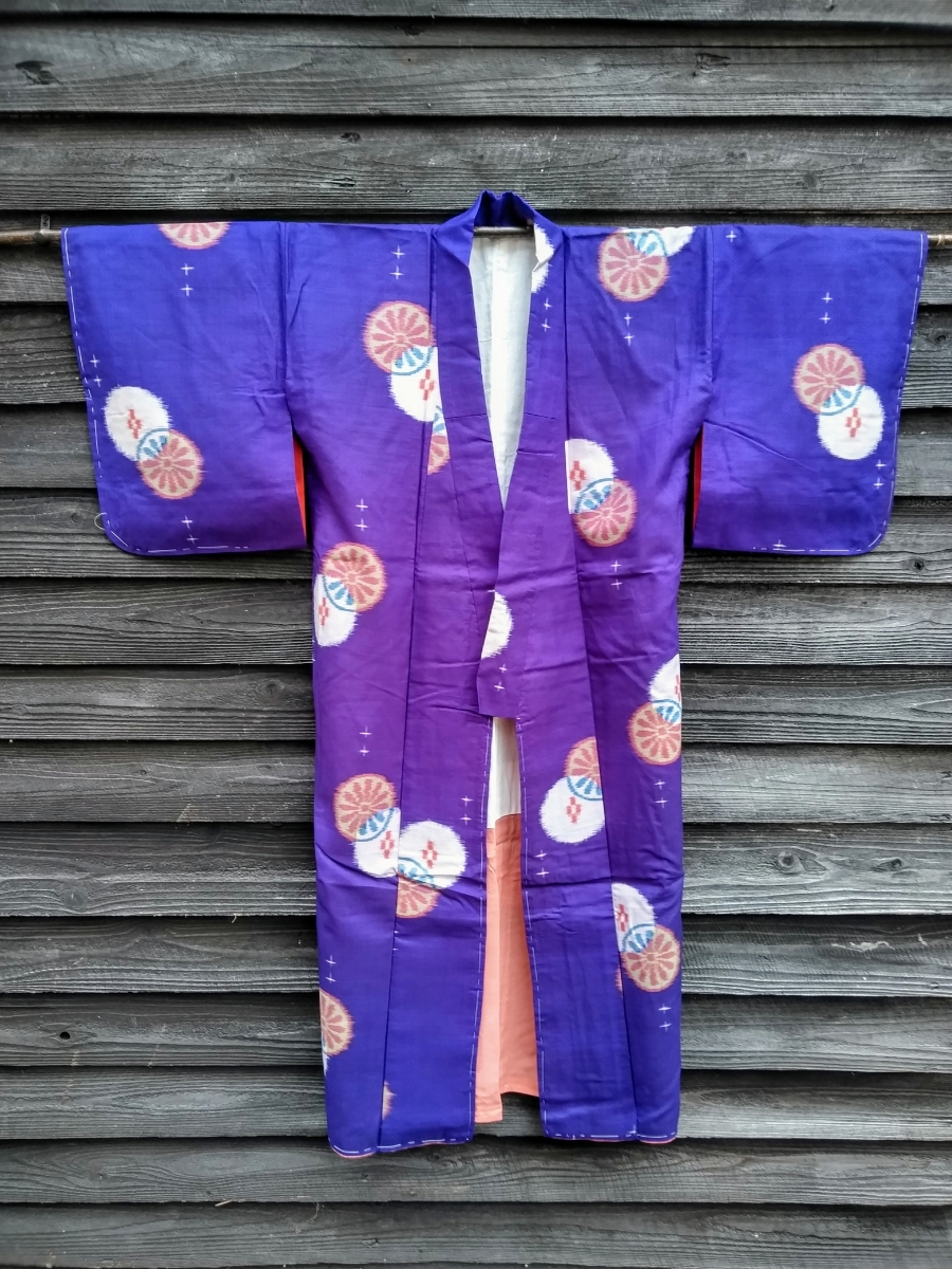 - 大正ロマン 紫が鮮やか正絹木綿混織 綺麗な絣 しつけ糸付