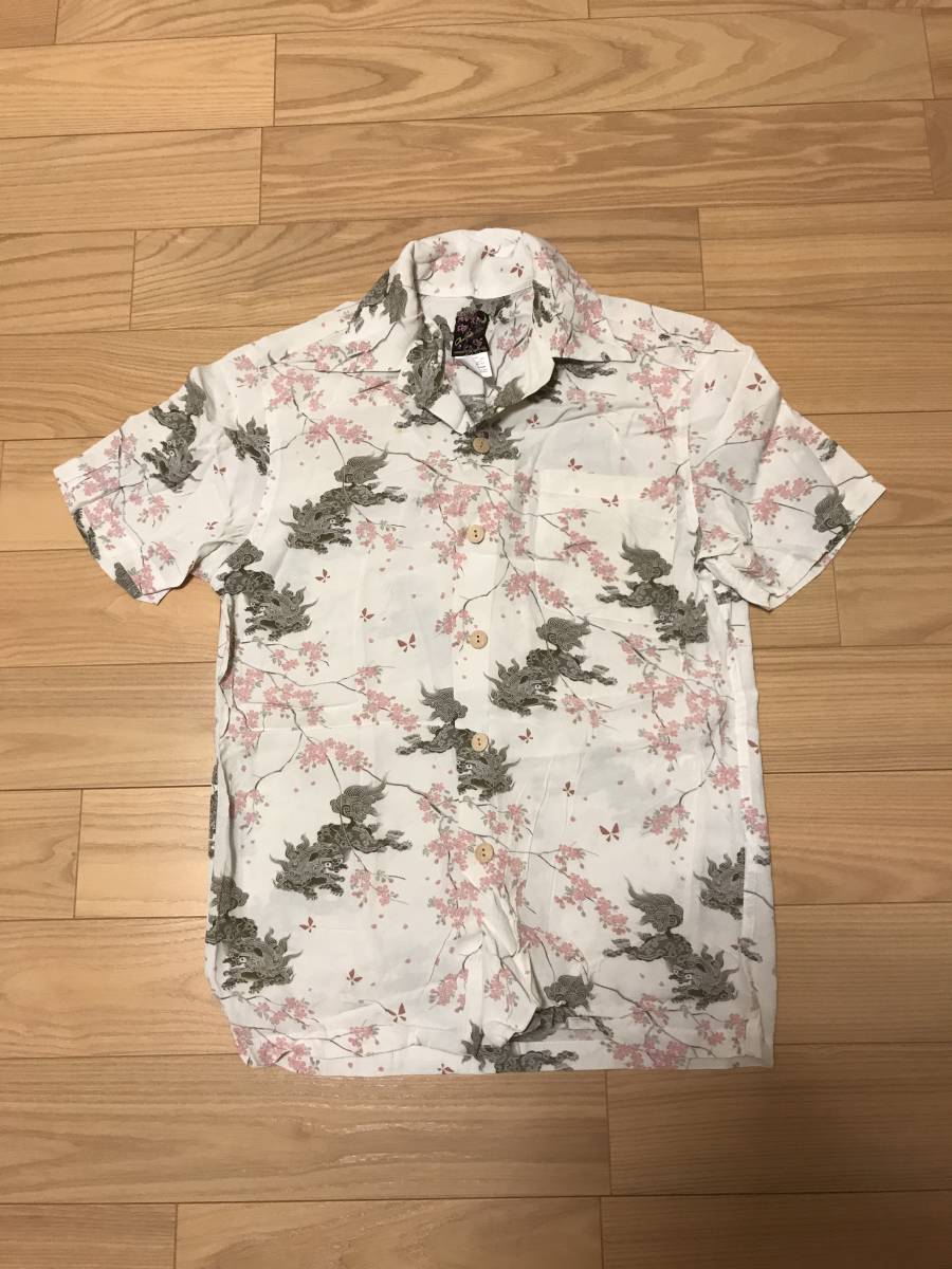 - 良品☆Oniwasoto/サイズM 和柄 VINTAGE Japanese pattern 半袖 壁縮緬.ちりめんレーヨン アロハシャツ 狛犬獅子舞&桜 総柄 ビンテージ VTG