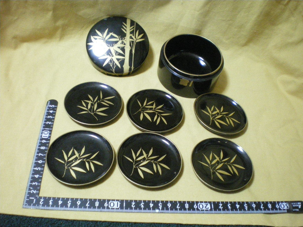 - 珍品フリマ・うるし・漆器] 小キズ・くすみあり 漆塗り小皿6枚が漆器内に収納 小皿外径8cm 高さ8mm 収納器外径9.6cm 高さ6cm [送料無料]