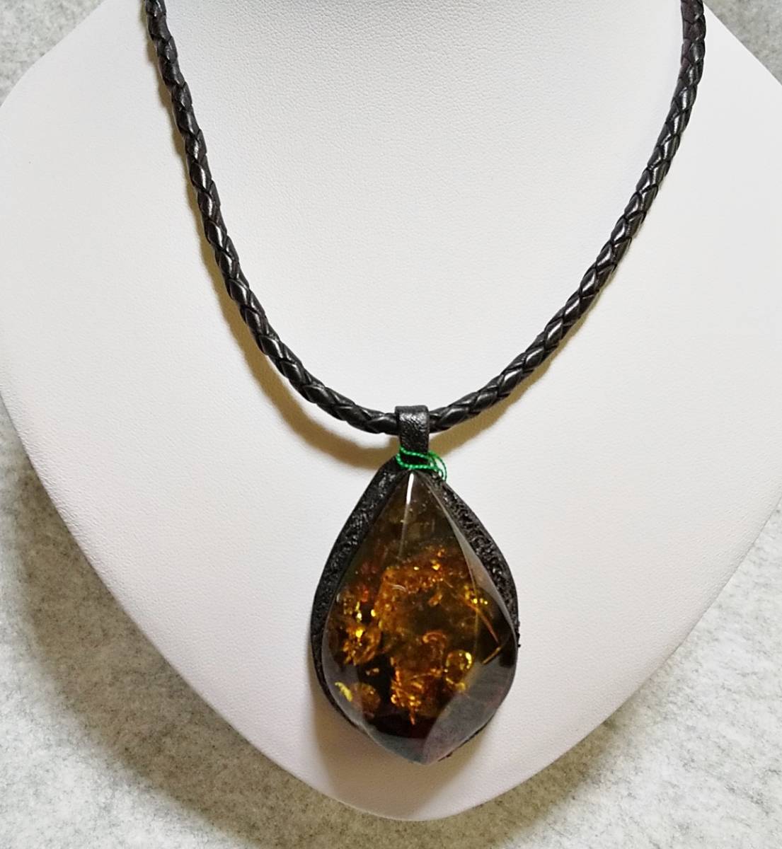 - ★最終80%OFF 琥珀 天然石 レザーペンダント 大粒 マーブルアンバー しずく形三面 展示品★F4193