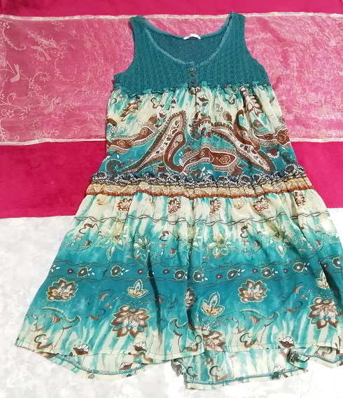 > 緑グリーンエスニック柄ニットネグリジェシフォンスカートワンピース Green ethnic pattern knit negligee chiffon skirt dress