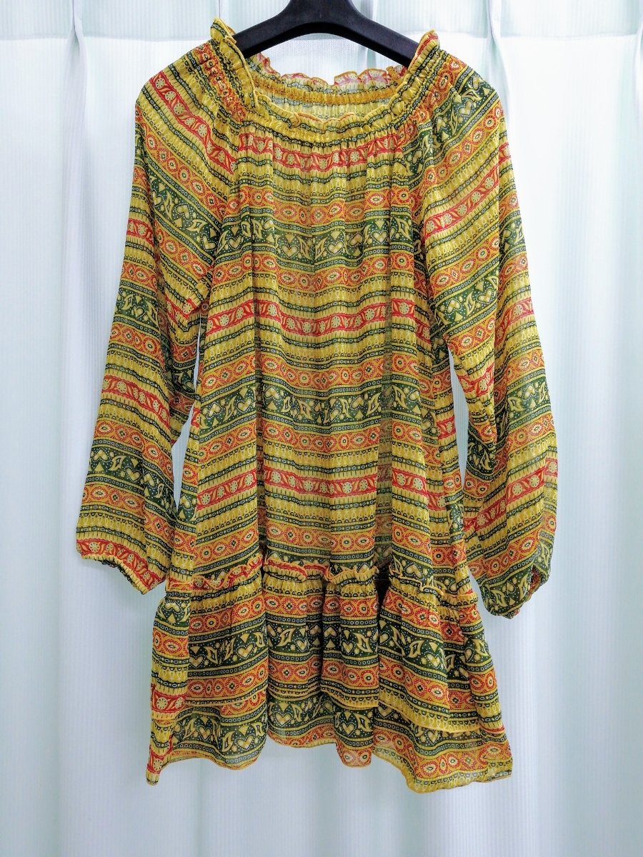 > ★未使用 COCUEコキュ長袖チュニック ミニワンピース02 (M) 日本製 シフォン カラシ色ベース エスニック 2段フリル ワールド