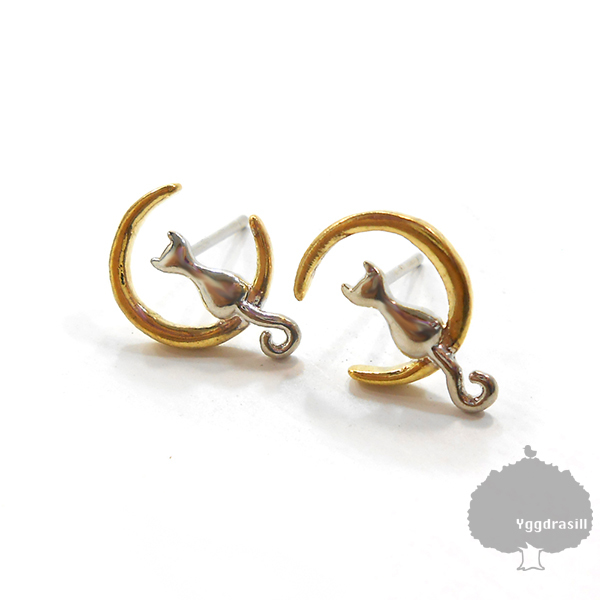 > YGG★新品 ムーンキャット ピアス ペア 2個セット 猫 月 ゴールド×シルバー 金×銀 レディース 三日月 猫 後姿 耳飾 両耳