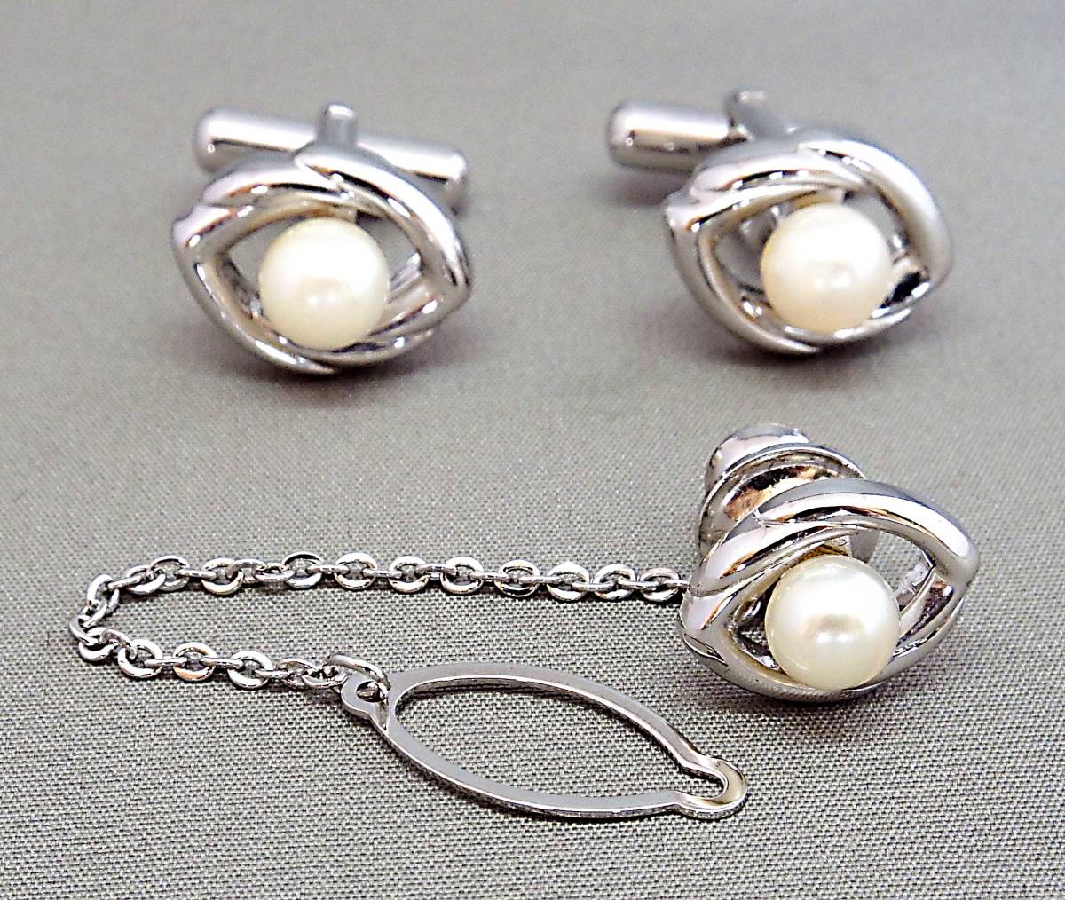 - EU-9921■アコヤ養殖真珠 カフス&タイタックセット 中古