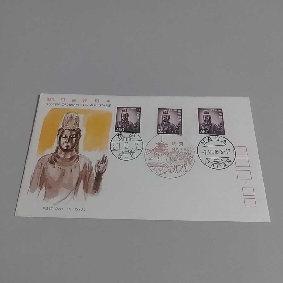 - ①初日カバー 昭和51年6月7日 奈良消印 350円郵便切手三枚 薬師寺観音菩薩立像