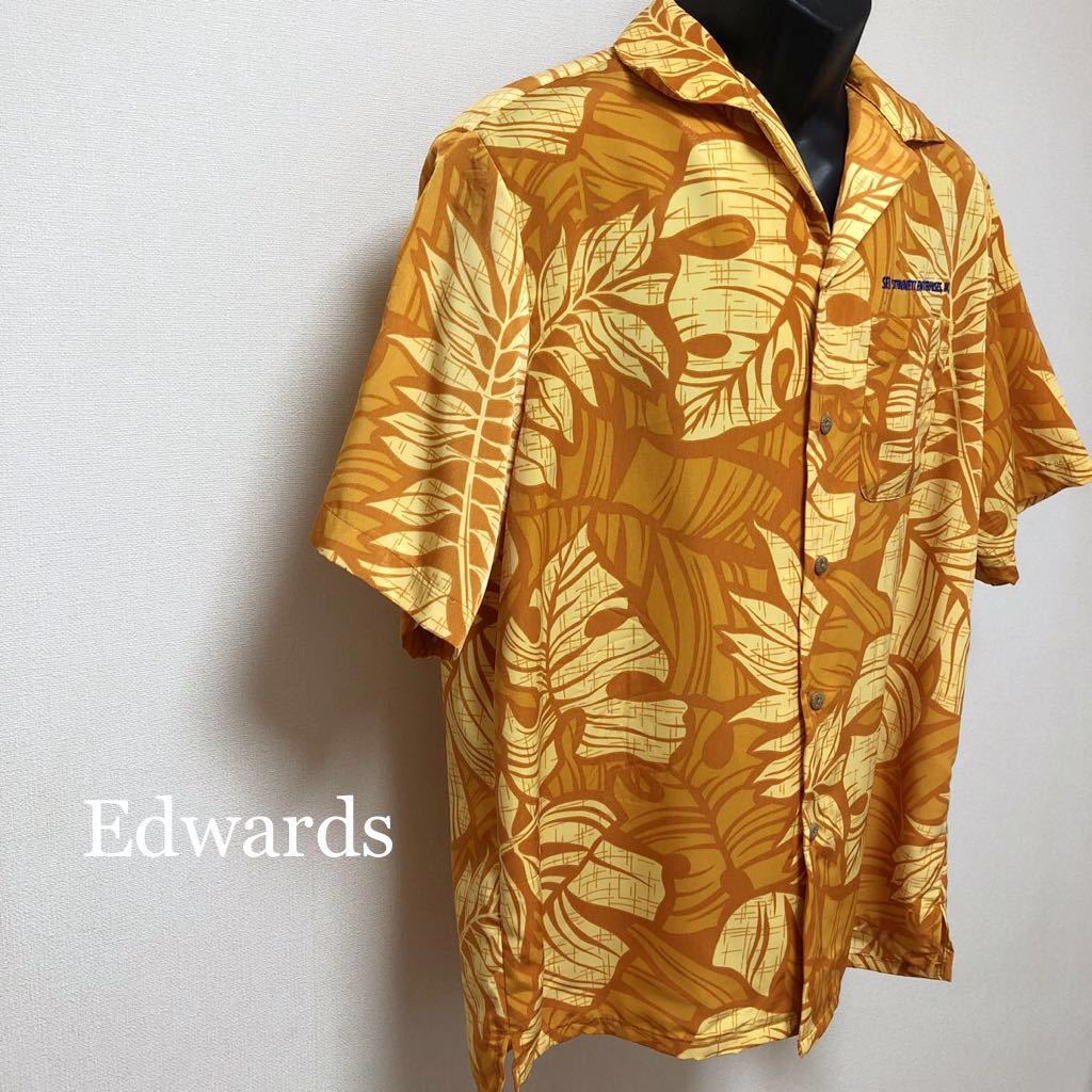 > 【Edwards】メンズ size M/半袖シャツ アロハシャツ ハワイアンシャツ オレンジ 総柄 胸ポケ 企業系 ポリエステル100% アメカジ USA古着
