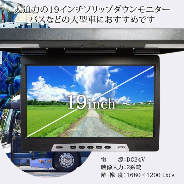 > 24V 専用 19インチ フリップダウンモニター 150度展開可能 ルームランプ内蔵 赤外線 ヘッドホン対応 解像度 1680×1200 UXGA 1年保証