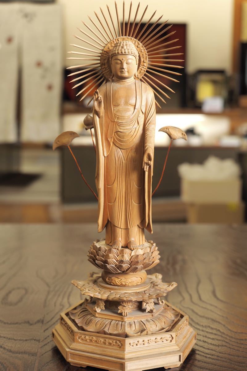 - 新品未使用 総白檀 阿弥陀如来像 東立弥陀 6.0寸 八角台座 仏像 木彫 仏教美術