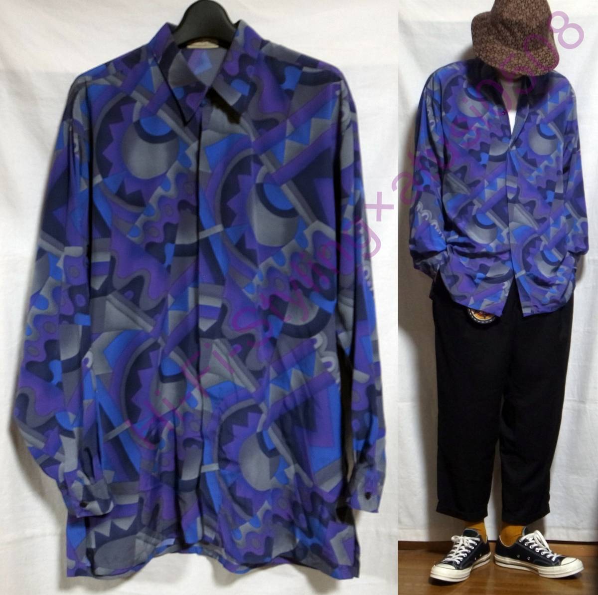 > ヴィンテージ パープル基調 アーティスティック 総柄 長袖 シャツ 柄シャツ F フリーサイズ アンティーク vintage 古着