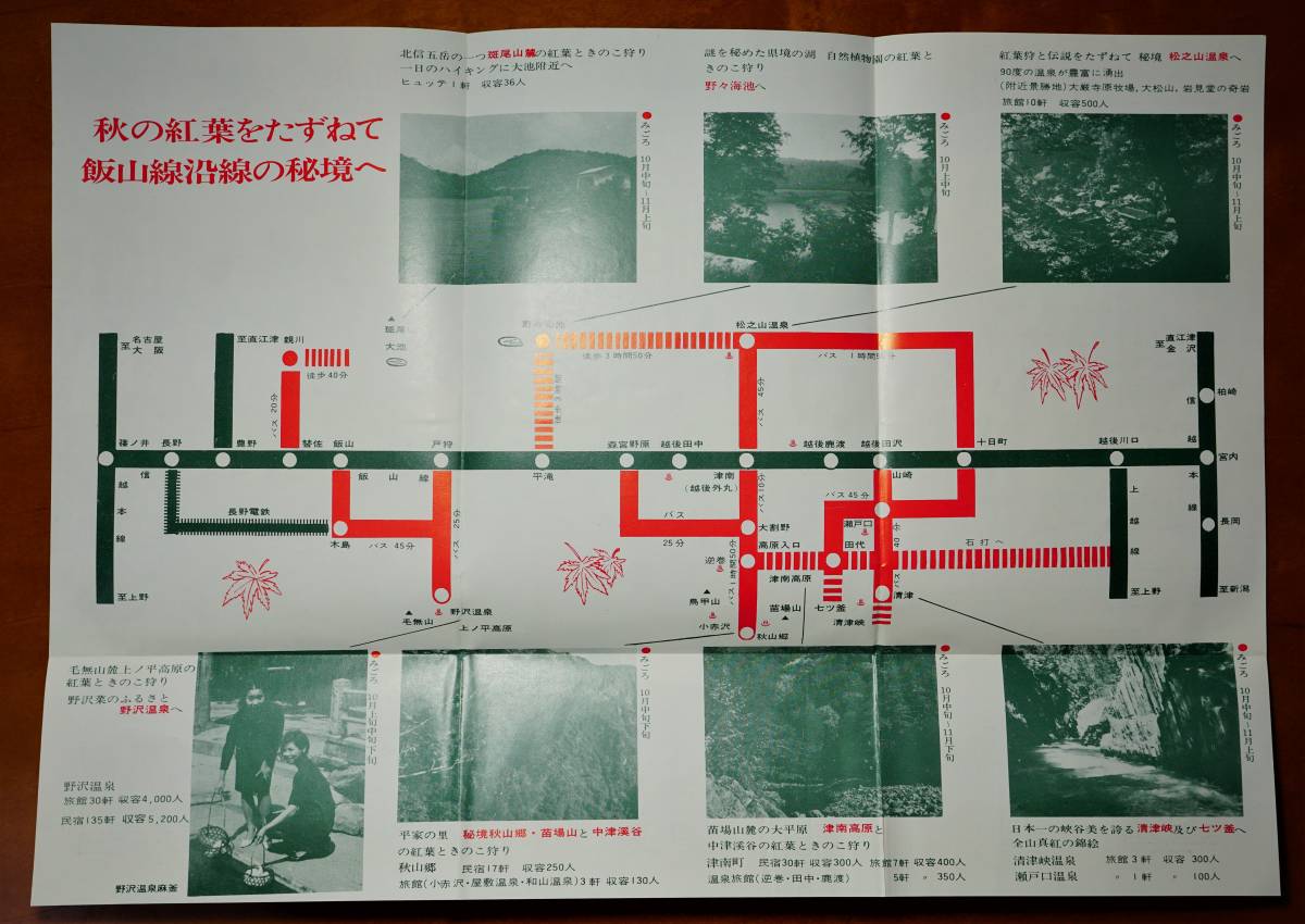 - 紅葉をたずねて 秋の飯山線沿線観光地案内 長野鉄道管理局 1枚 :鉄道路線図 時刻表・斑尾 野々海池 松之山 野沢温泉 秋山郷 津南 清津峡