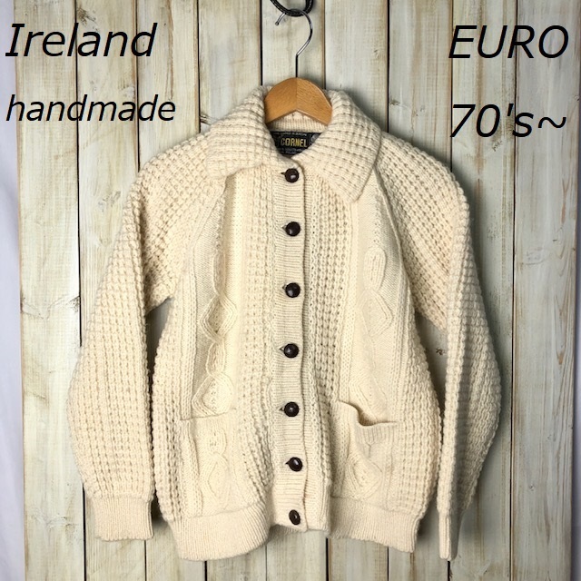 > ヴィンテージ 70's~ 北欧 アイルランド製 CORNEL 手編み ウールケーブルニットカーディガン M アランセーター フィッシャーマン ●37