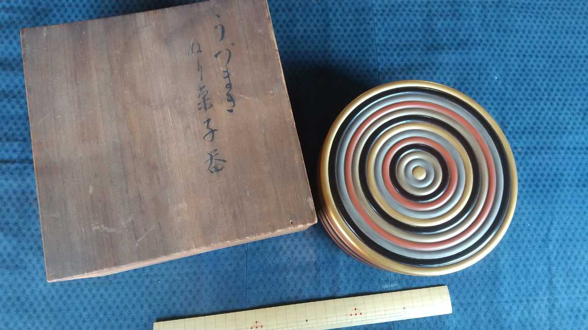 - 金銀赤黒でうずまきに塗られた菓子器 淡く力強い色味に調整されてる塗が見事 箱から推察すると100年前後の年代物