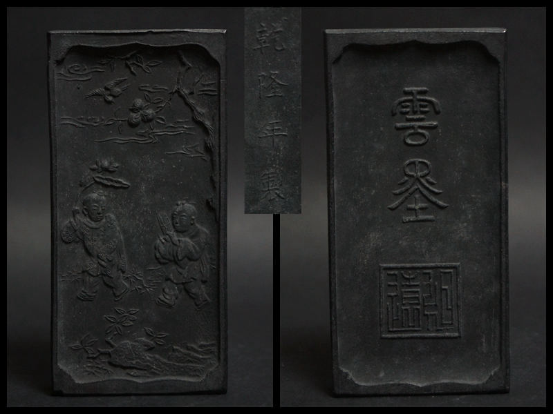 - 【閑】乾隆年製 細工彫『唐子人物物語文』雲墨 墨 /書道具☆時代物☆3C0406■