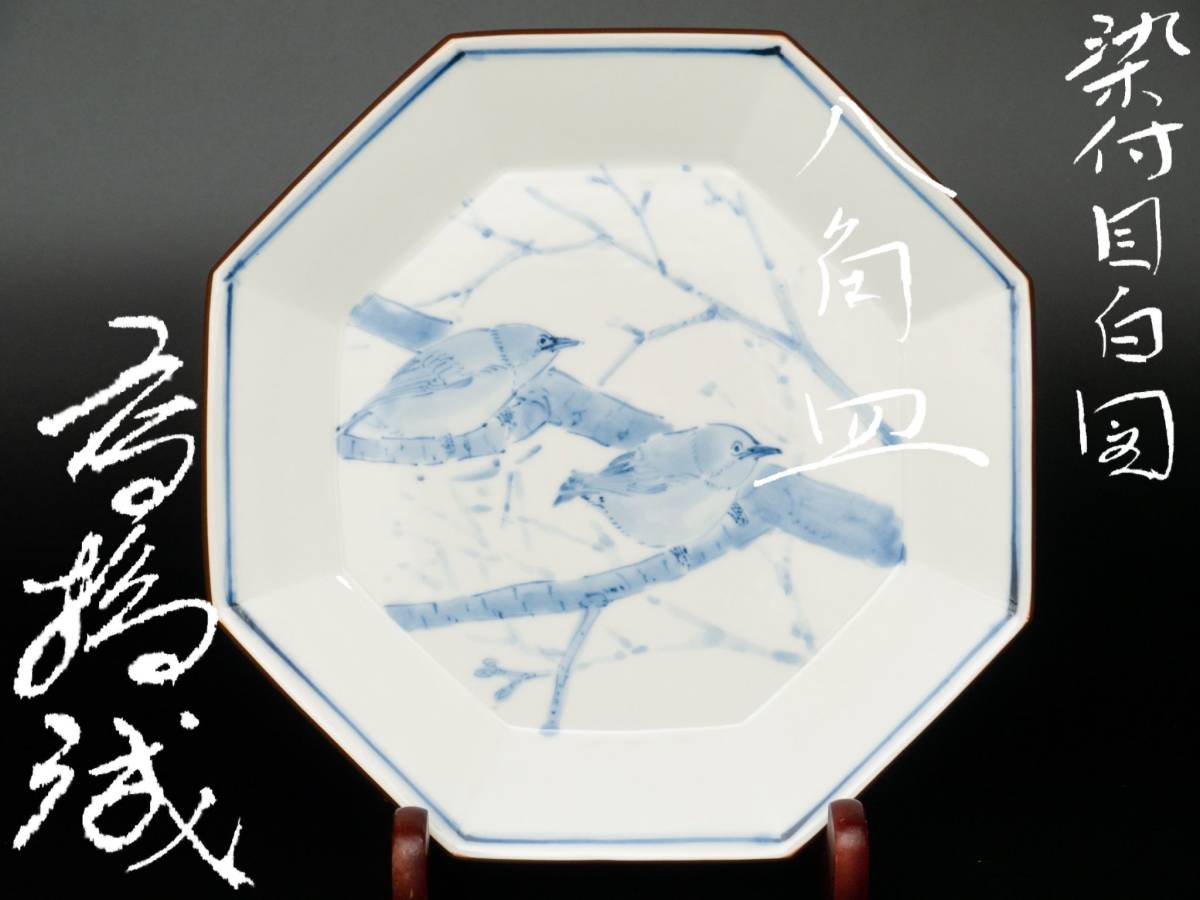 - 【値下げ交渉有り】 高橋誠 造 師:人間国宝 藤本能道 田村耕一 個展作品 染付 目白図 八角皿 共箱