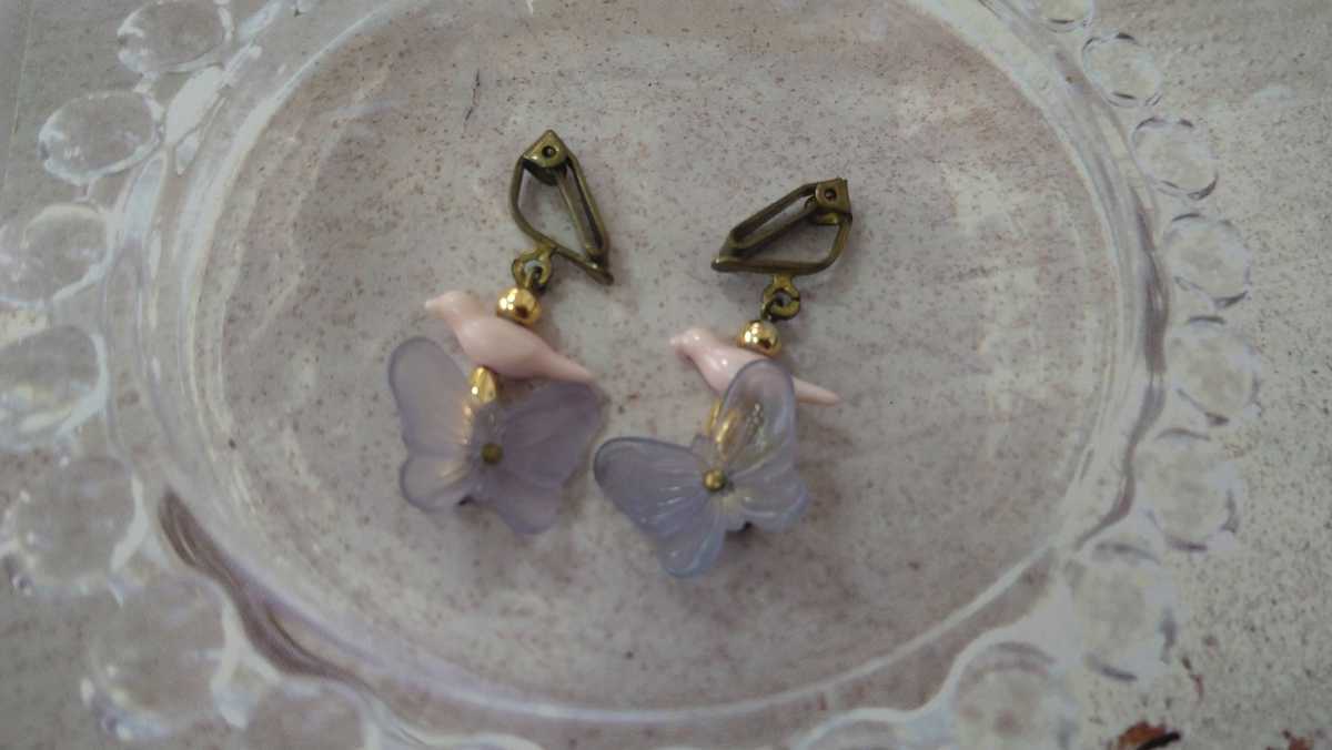 - □訳あり□うす紫×うすピンク・小鳥&蝶々モチーフ・イヤリング□