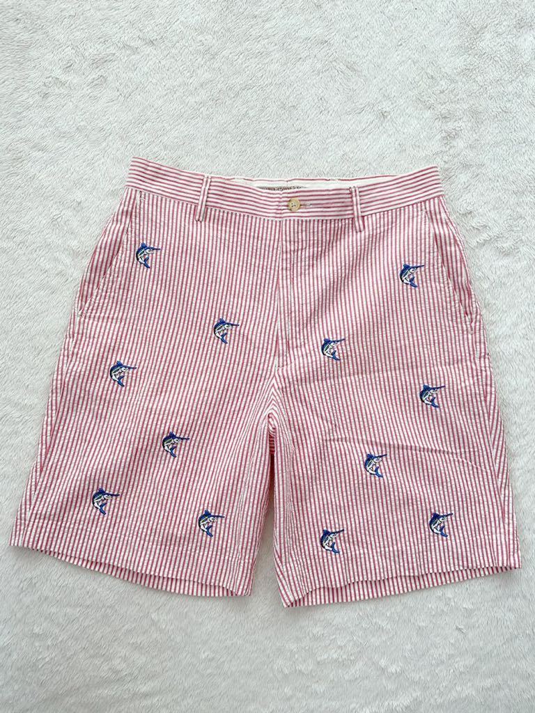 - ビームス購入 BERLE size30 USA製刺繍入りショートパンツ シアサッカー ストライプ メンズ ベルレ べルーレ BEAMS購入 rrl beams plus
