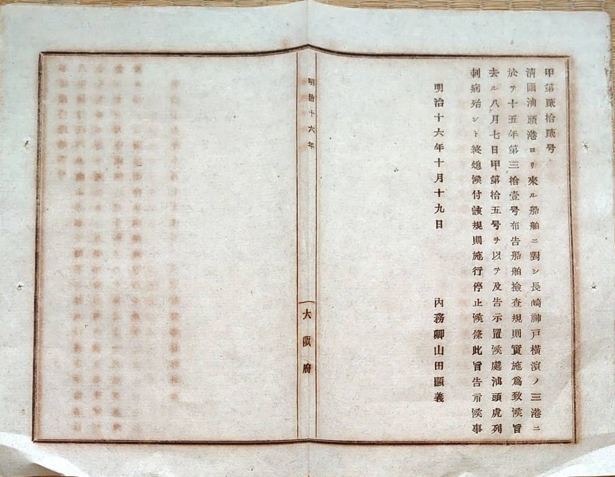 - f21070401〇明治布告 清国油頭港より来る船舶に対し長崎神戸横浜の三港に於いてコレラ病対策船舶検査 施行停止 明治16年〇和本古書古文書