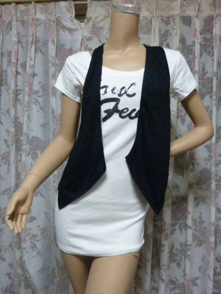 > 匿名配送 送料無料 未使用 ベスト付き スパンコール ロゴ チュニック Tシャツ ホワイト 白 おしゃれコーデ レディース M 半袖 綿 コットン