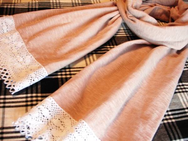 - ローズ色ストール★接結ガーゼニット 綿 レース ハンドメイド