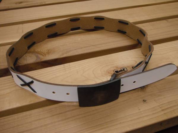 > 当店オリジナル製作!! 牛革ベルト新品[白ベルト×黒革ひも][S=約80cm][バックル2種付き]が送料無料で! (※レッドムーン風デザイン)