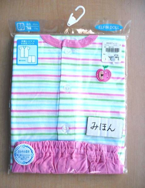 > ★お買い得★新品★即決★半袖シャツ5分丈パンツ80りんご12m入園夏女児出産祝い誕生日プレゼントかわいいピンクボーダー赤ちゃん服