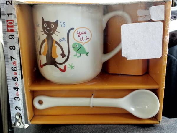 - 超素敵☆陶器製☆猫と魚の戯れ☆マグカップ&スプーン☆残1