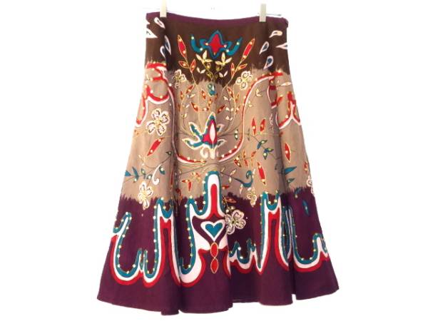 > ● VERO MODA 柄 フレアースカート 36 M スパンコール パープル ベージュ コットン ゴールド ステッチ 花 葉っぱ 華やか 裏地付き 素敵