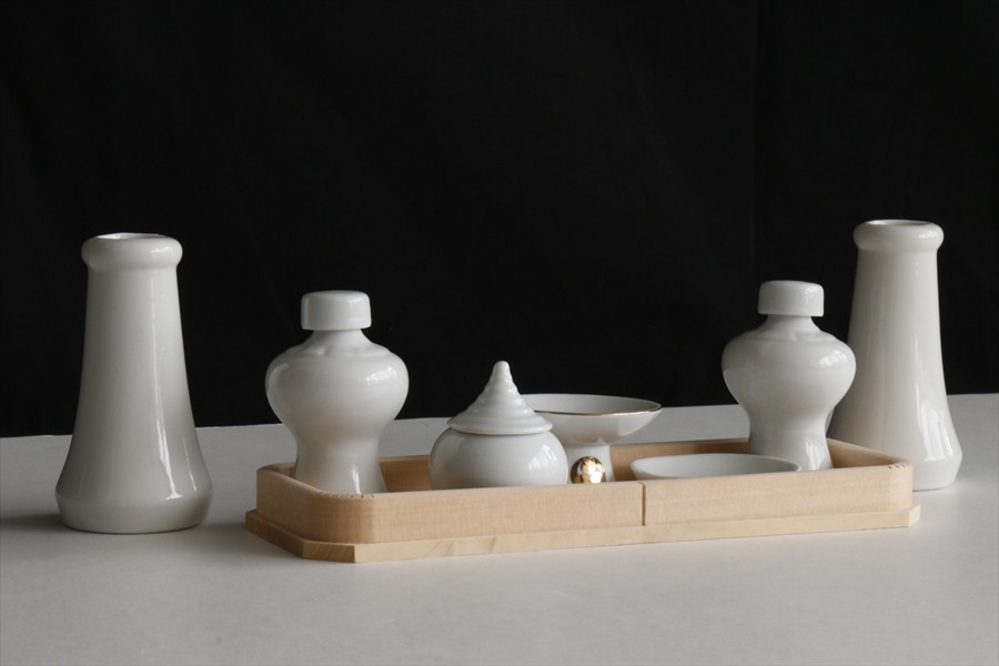 - 国産 神具セット 土器セット ともえ ■ 巴紋 高杯仕様 ■木曽ひのき製 長折敷付 小・中型 神棚に最適