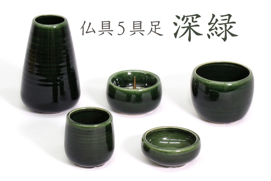 - 国産 仏具 仏具セット ■ 和柄 5点セット 深緑 ■ モダン 家具調 仏壇 お供え ■ 香炉灰付 お盆 お彼岸 お墓参り 供養
