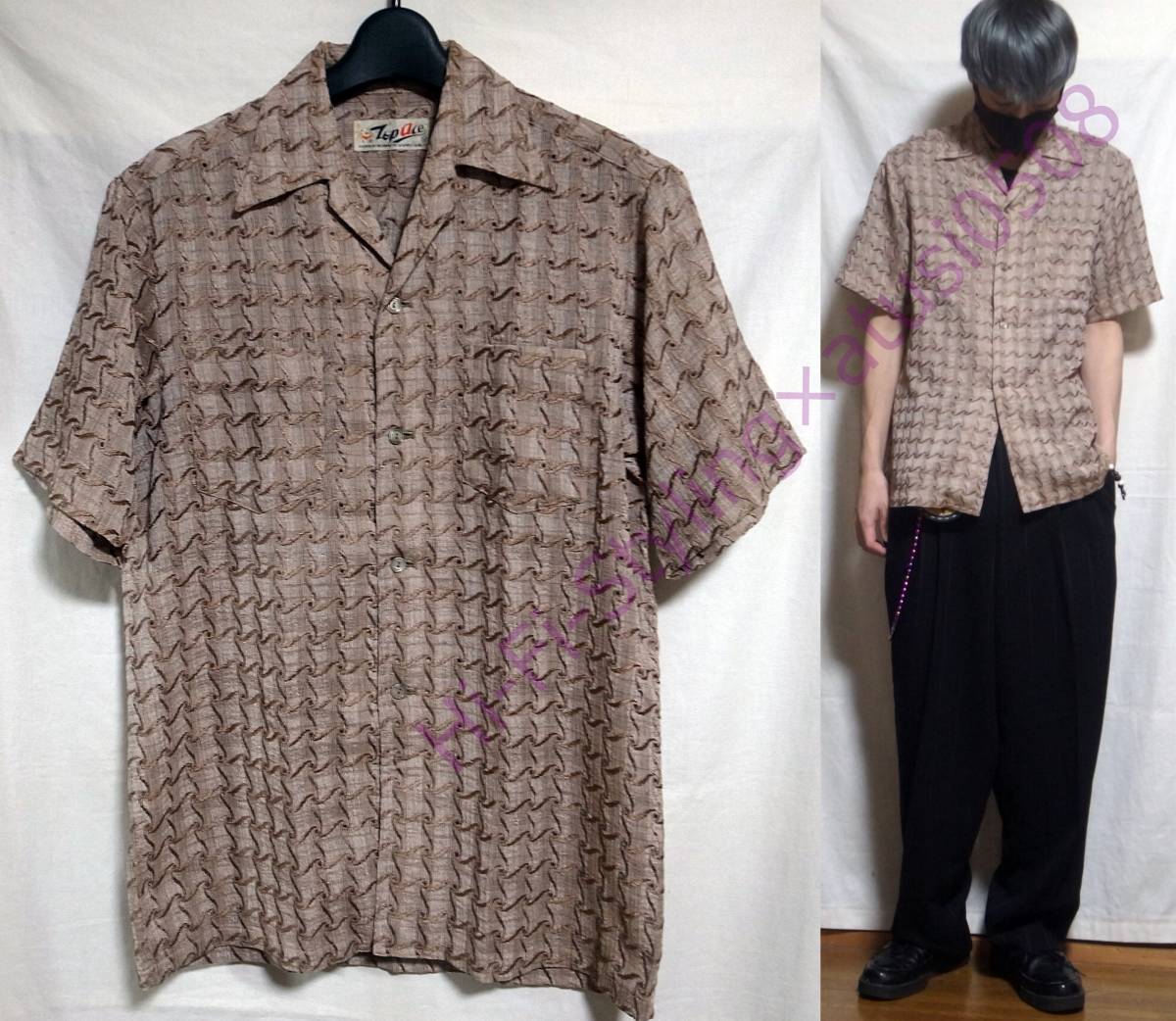 - 古着 総柄 刺繍 デザインシャツ 半袖 開襟 開襟シャツ ヴィンテージ 刺繍シャツ M ブラウン 茶色
