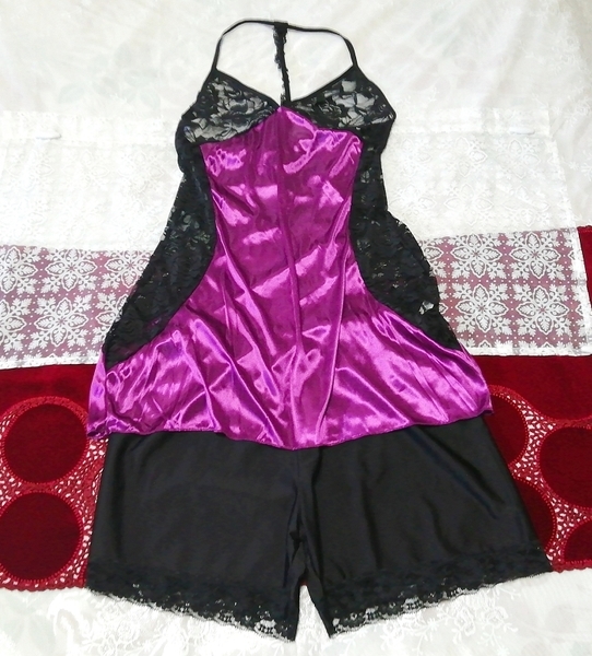 > 紫サテン黒レースキャミソール ネグリジェ ナイトウェア ショートパンツ 2P Purple satin black lace camisole negligee nightwear shorts
