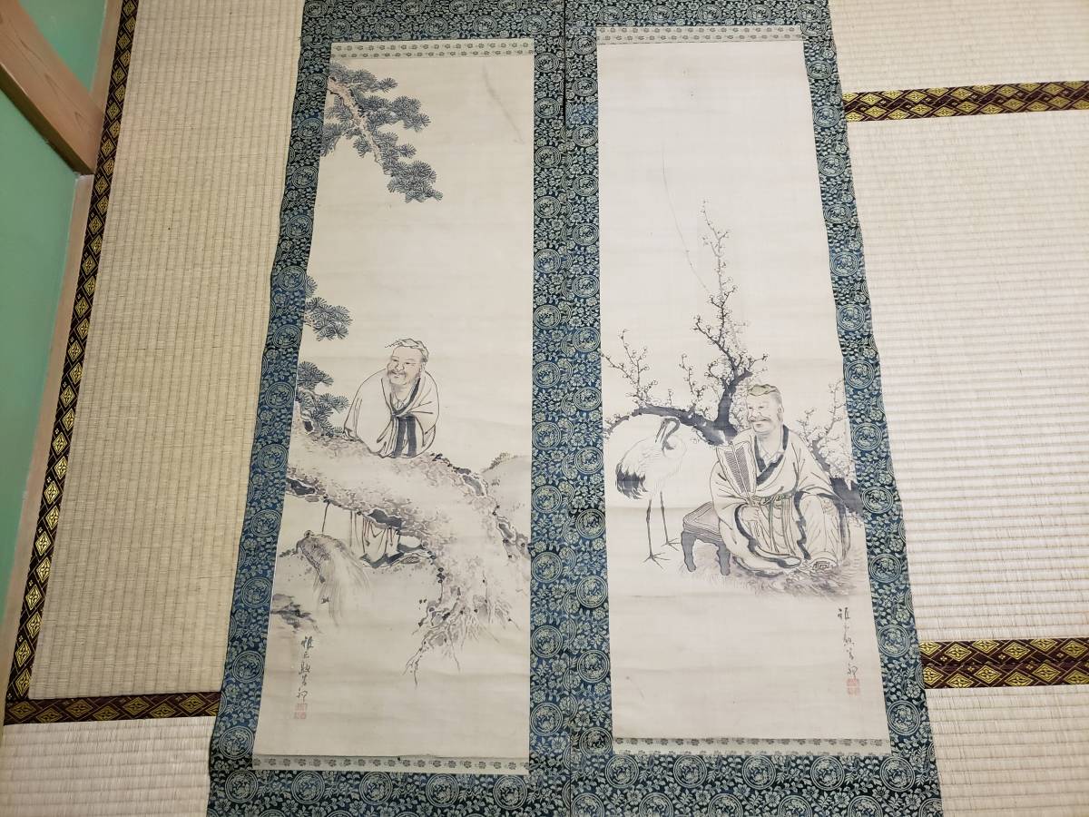 - 古美術 骨董 岸駒筆 梅鶴老人 松亀老人 絹本 雙幅 掛軸