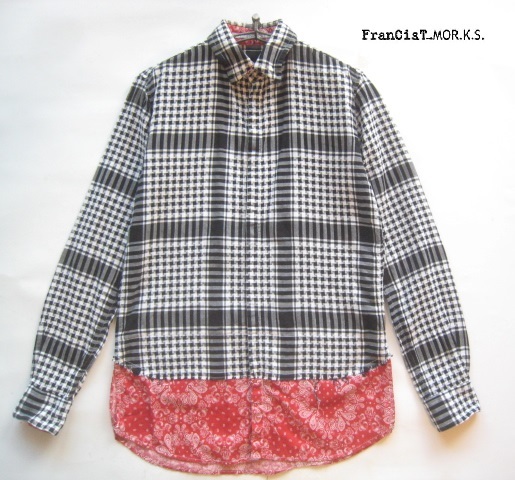 > 美品!!フランシストモークス FranCis.T.MOR.K.S.*ほつれ加工 チェック柄&ペイズリー柄切り替えシャツ 2 実寸M 白×黒×赤 日本製