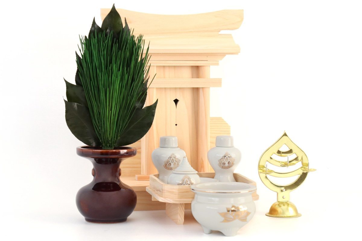 - 神棚セット 荒神宮 モダン 専用神具 榊 プリザーブド荒神松 荒神紋 陶器セット