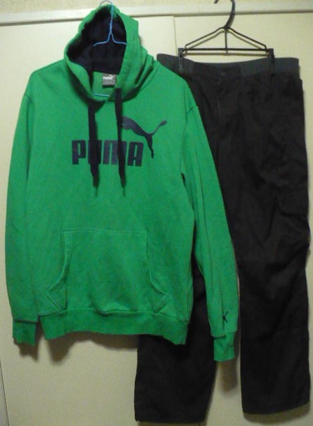 > 送料込み PUMA(プーマ)製綿?・ジャージパンツ・パーカー・シャツ・バッグ等6点以上セット M~O 黒・緑・青 おまけ付き 着(枚)数増