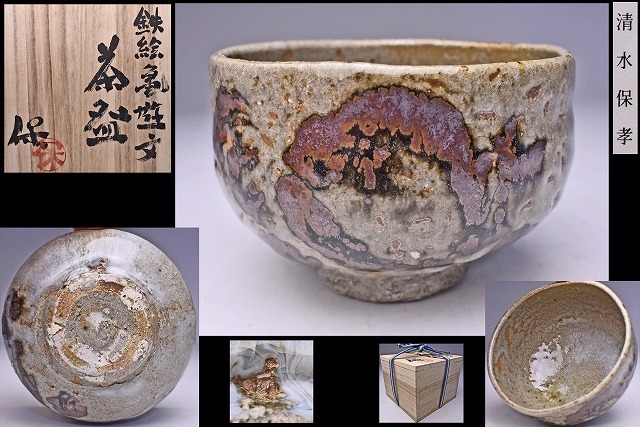 > 清水保孝 ★ 鉄絵 亀遊文 茶碗 ★ 共箱 栞 ★ 父:人間国宝 清水卯一 ★ 絵唐津を思わせる味わいのある上作 ★ 茶道具 ★