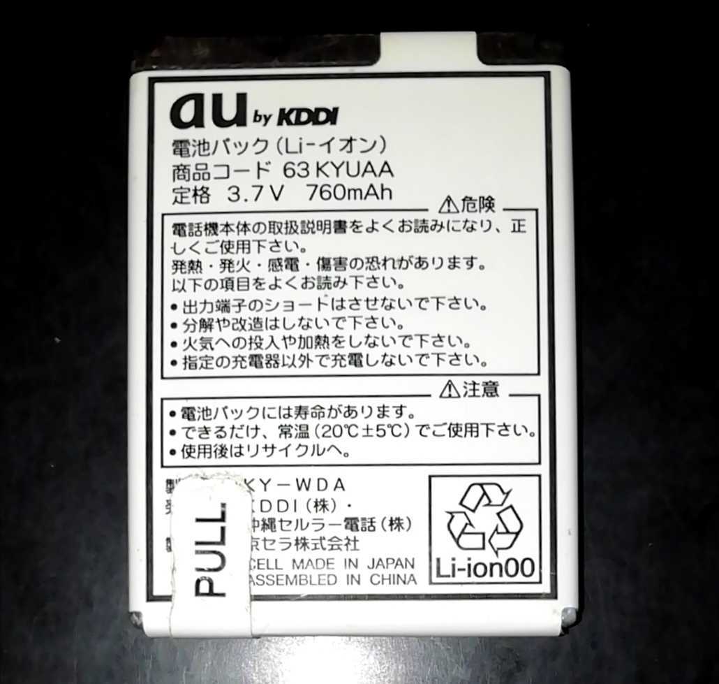 - 【中古・残り1個】au純正63KYUAA電池パックバッテリー【充電確認済】対応機種(参考)W63K/WX320K
