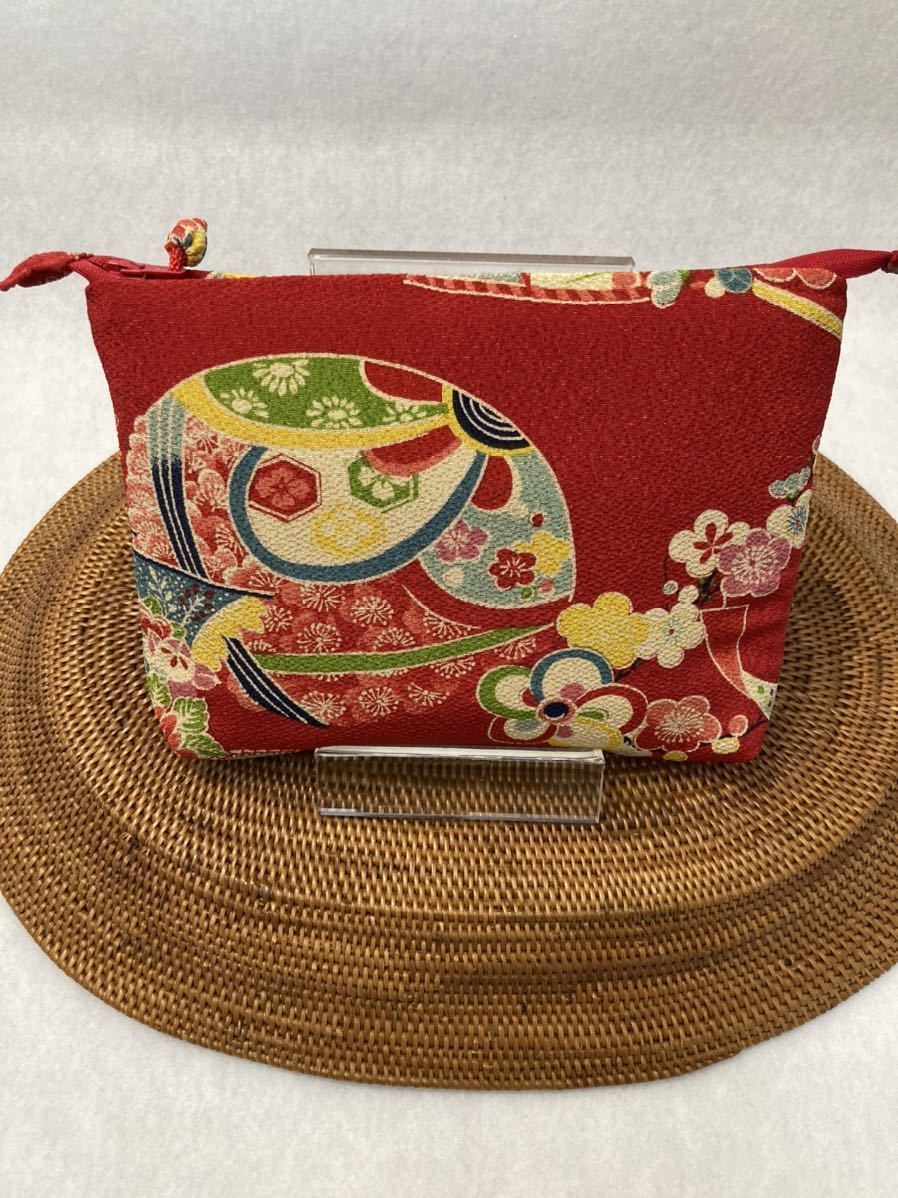 - 送料無料♪ギフトにも! 古典柄*ちりめんファスナーポーチ* 赤(内黒水玉)☆御朱印帳 小入ります☆ CHACAPEE オリジナル