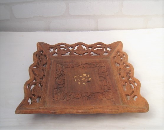 - 14N3.3-12 木彫りのトレー お盆 盛皿 飾り皿 木製 サイズ:約23.7×23.7×H4.5㎝