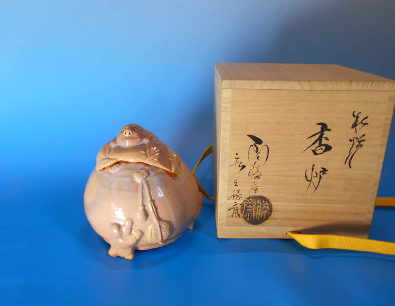 - 萩焼 陶勝庵 永久勝斎 布袋 布袋頭 香炉 共箱 茶道具 香道具 同梱r可 希少