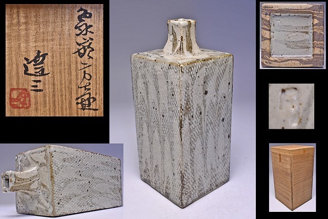 > 島岡達三 ★ 象嵌 方壺 ★ 共箱 ★ 人間国宝 ★師:浜田庄司 ★ 練上げタイプ 角瓶 益子焼 民芸陶 ★検 島岡桂 ゲルトクナッパー 松崎健 ★